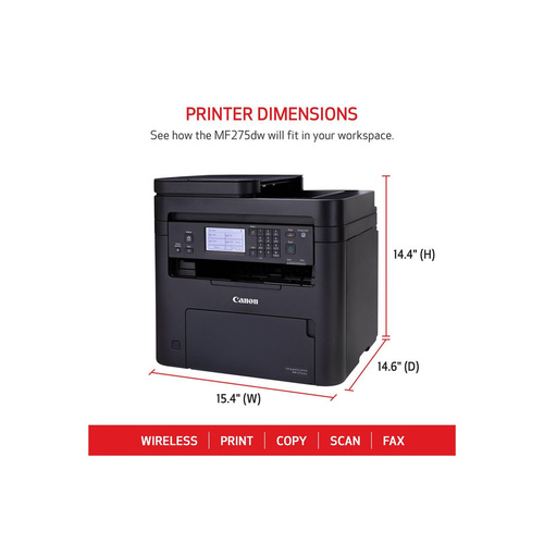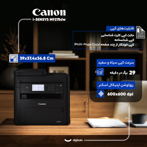 خرید اینترنتی پرینتر چند کاره لیزری کانن مدل i-SENSYS MF275dw با رنگبندی مشکی، مشکی مات به همراه مقایسه، بررسی مشخصات و لیست قیمت امروز در فروشگاه اینترنتی پیشگام دیجیتال