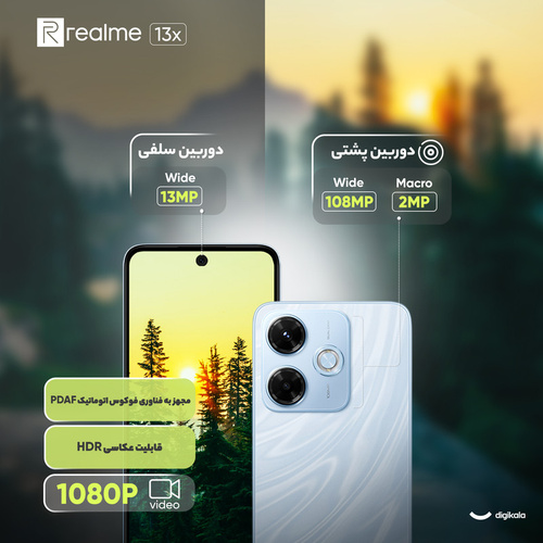 گوشی Redmi 13X یکی از میانردههای تازهنفس شیائومی و نسخه ارتقا یافته سری پرطرفدار Redmi 13 است که با ترکیبی هوشمند از طراحی جذاب، نمایشگر باکیفیت و سختافزار متعادل، توجه بسیاری از کاربران را جلب کرده است. این گوشی با بدنهای شیشهای و فریم پلاستیکی، ظاهری مدرن و خوشدست دارد و گواهی IP53 مقاومت در برابر گردوغبار و پاشش آب، دوام آن را در استفاده روزمره تضمین میکند. نمایشگر بزرگ 6.79 اینچی از نوع IPS LCD با نرخ نوسازی 90 هرتز و وضوح Full HD+، تجربهای روان و چشمنواز در تماشای محتوا و بازیها ارائه میدهد. شیائومی برای Redmi 13X از تراشه Helio G91 Ultra استفاده کرده که عملکردی سریع و روان را در کارهای روزمره و اجرای بازیهای سبک فراهم میسازد. دوربین اصلی این گوشی با رزولوشن 108 مگاپیکسلی، نقطه قوت اصلی آن است که عکسهایی با جزئیات بالا و رنگهای طبیعی ثبت میکند، دیگر دوربین هم یک دوربین ماکرو 2 مگاپیکسلی است که برای ثبت سوژههای نزدیک کاربرد دارد. دوربین سلفی 13 مگاپیکسلی هم کیفیت قابلقبولی برای تماس و عکسهای روزمره دارد. و در آخر باتری قدرتمند 5030 میلیآمپرساعتی با پشتیبانی از شارژ سریع 33 واتی، Redmi 13X را به گزینهای ایدهآل برای کاربران پرمصرف تبدیل کرده است. در مجموع، این گوشی با سیستمعامل Android 14، ترکیبی از عملکرد، طراحی و قیمت مناسب را ارائه میدهد.